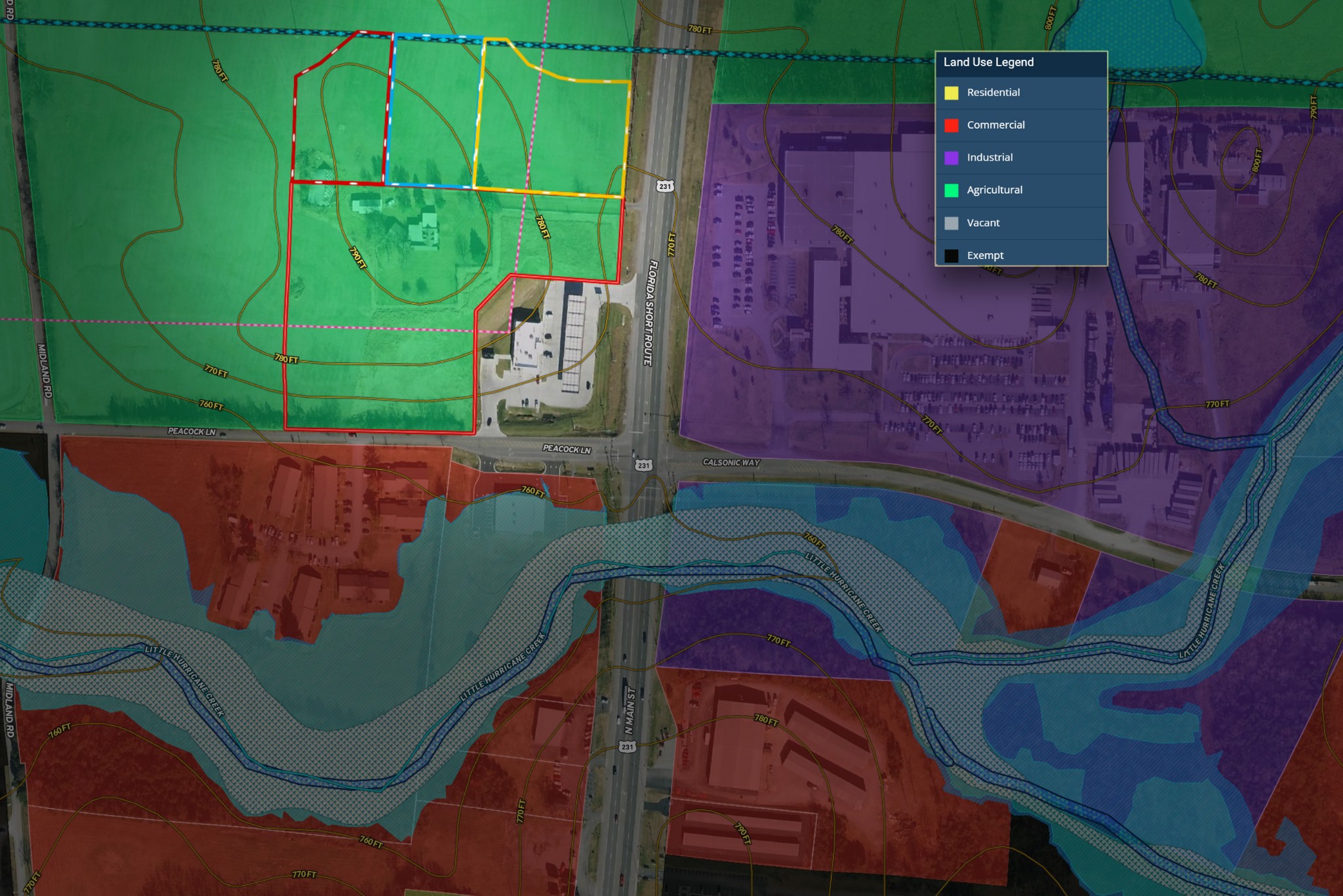 67.87 Acres.. One of the best future development properties in our entire county! 20 acres already being in the city limits with sewer, gas & water, fronts 3 roads (Peacock, Midland and Highway 231) Call for details and showings by appointment only.